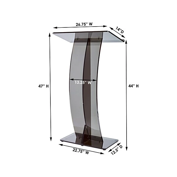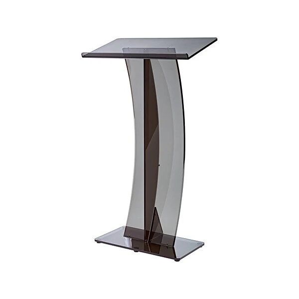- SLEEK, CONTEMPORARY DESIGN. Offered in a sparkling clear or see-through black, the podium boasts a slanted stem to give it a stylish, professional look that will enhance any interior design. Additionally, the large, 22¾-inch base features four acrylic base pads to protect flooring surfaces.