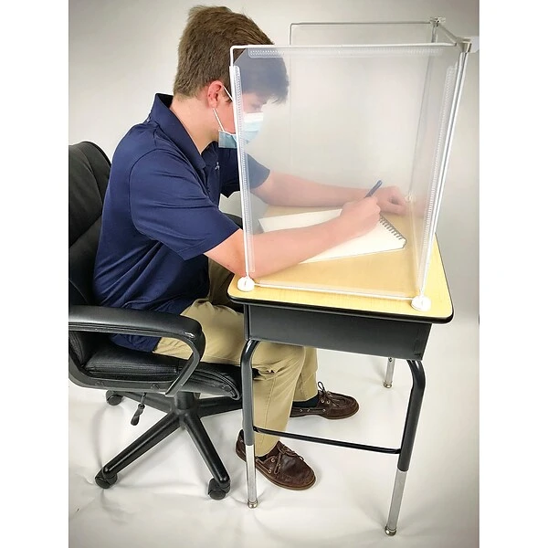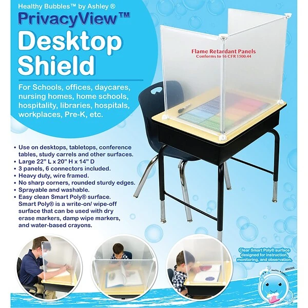 PrivacyView™ Desktop Divider Plastic measures 22″W x 20″H x 14″D. The divider is easy to set up on any desk or location and can be cleaned easily. Made with fire retardant panels. Includes 3 panels and 6 connectors.