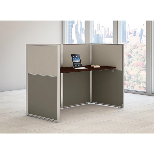 Easy Office 60W x 24D Straight Desk Closed Office offers a contemporary style designed with flexibility to fit your space. Durable thermally fused laminate work surface features superior resistance to scratches and stains, with wire management to keep cords organized. Desk attaches to sturdy 45H wall panels with Light Gray and Storm Gray two-toned fabric that compliments the warmth of the Mocha Cherry work surface. Designed for fast assembly with commercial construction that meets ANSI/BIFMA standards for safety and performance, backed by a 10 Year Warranty.