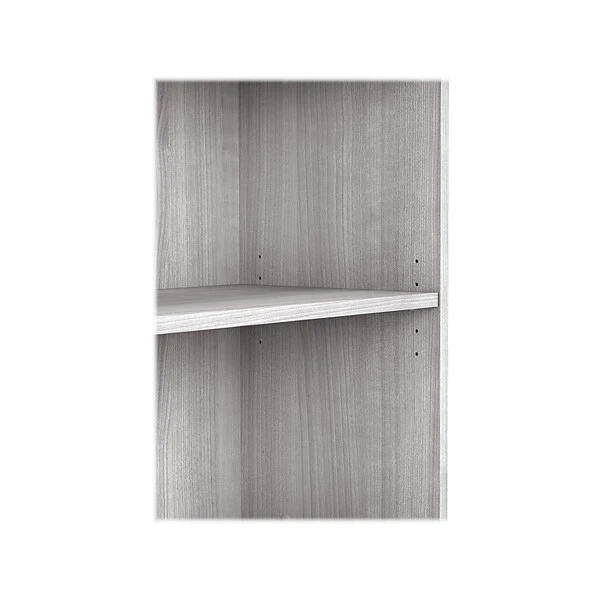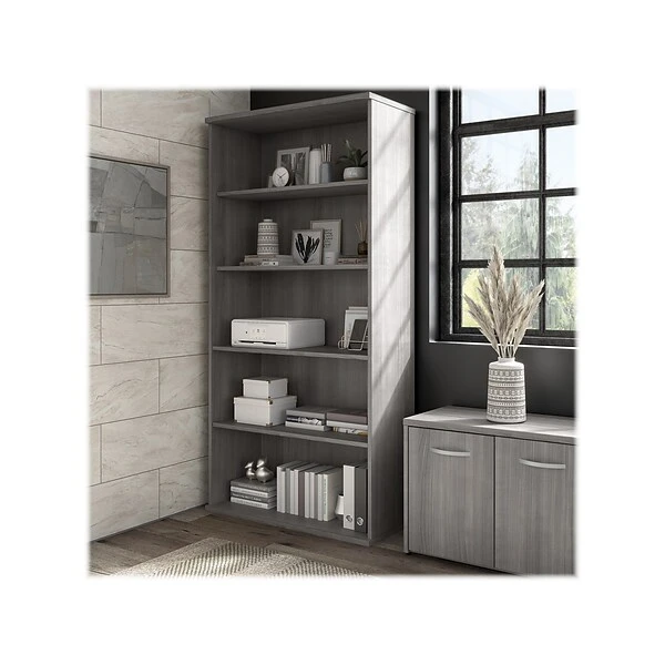The Bush Business Furniture Hybrid tall five-shelf bookcase offers a stylish, long-lasting storage and display solution for the modern professional. Organize books and other reference materials, or give your workspace a personal touch with pictures and decorations on shelves that support up to 50 lbs. each. Two shelves are fixed for stability, while three can be raised or lowered to accommodate items of various sizes. The tall bookcase’s stable design and included wall attachment hardware make it a safe choice for use in virtually any home or professional office environment. Find the perfect look for your space with five contemporary finish options: black walnut, modern hickory, platinum gray, storm gray, and white. This tall bookcase cabinet has been meticulously tested to meet or exceed ANSI/BIFMA quality standards for safety, durability, and performance and is backed by the Bush Business Furniture 10-year manufacturer warranty. See the full Bush Business Furniture Hybrid collection for coordinating items to enhance your workspace as needed, including computer desks, file cabinets, and storage cabinets (coordinating items sold separately). American-made with US and imported parts.