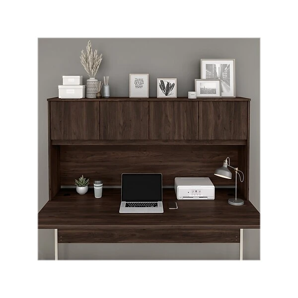 The Bush Business Furniture Hybrid 71″W desk hutch offers a stylish, long-lasting storage solution for a modern professional. Attach the hutch to a coordinating Hybrid collection 71″W computer desk (sold separately) to maintain a neat and orderly workspace. Four cabinet doors conceal books, supplies, equipment, reference materials, and more, so your desktop remains clutter-free. Doors open on smooth Euro-style hinges for an effortless reach to contents. Find the perfect look for your space with five contemporary finish options: black walnut, modern hickory, platinum gray, storm gray, and white. This computer desk hutch has been meticulously tested to meet or exceed ANSI/BIFMA quality standards for safety, durability, and performance and is backed by the Bush Furniture 10-year manufacturer warranty. American-made with US and imported parts.