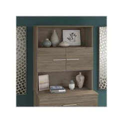 The Bush Business Furniture Office 500 36″W bookcase hutch offers an open display area to showcase your favorite pictures, awards, and decorations. With its combination of open and closed storage, this bookcase hutch is a perfect way to keep any workspace in order while showcasing the style and personality of today’s professional. This 36″W hutch attaches to the coordinating 36″W two-drawer lateral file cabinet or 36″W storage cabinet with doors (sold separately) for a complete organization solution. Two open shelves offer plenty of space to brighten up the room with your favorite books, pictures, awards, and decorations. A small cabinet conceals unsightly supplies and reference materials while keeping them easily accessible when you need them. Each shelf supports up to 50 lbs., so you can store and display larger items with confidence. This bookshelf hutch is tested to meet ANSI/BIFMA standards for safety and performance and is backed by a 10-year warranty. American-made with US and imported parts.