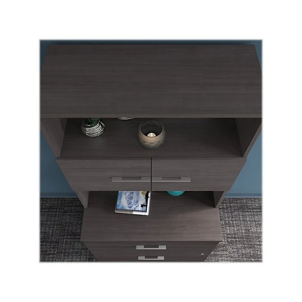 The Bush Business Furniture Office 500 36″W bookcase hutch offers an open display area to showcase your favorite pictures, awards, and decorations. With its combination of open and closed storage, this bookcase hutch is a perfect way to keep any workspace in order while showcasing the style and personality of today’s professional. This 36″W hutch attaches to the coordinating 36″W two-drawer lateral file cabinet or 36″W storage cabinet with doors (sold separately) for a complete organization solution. Two open shelves offer plenty of space to brighten up the room with your favorite books, pictures, awards, and decorations. A small cabinet conceals unsightly supplies and reference materials while keeping them easily accessible when you need them. Each shelf supports up to 50 lbs., so you can store and display larger items with confidence. This bookshelf hutch is tested to meet ANSI/BIFMA standards for safety and performance and is backed by a 10-year warranty. American-made with US and imported parts.