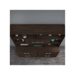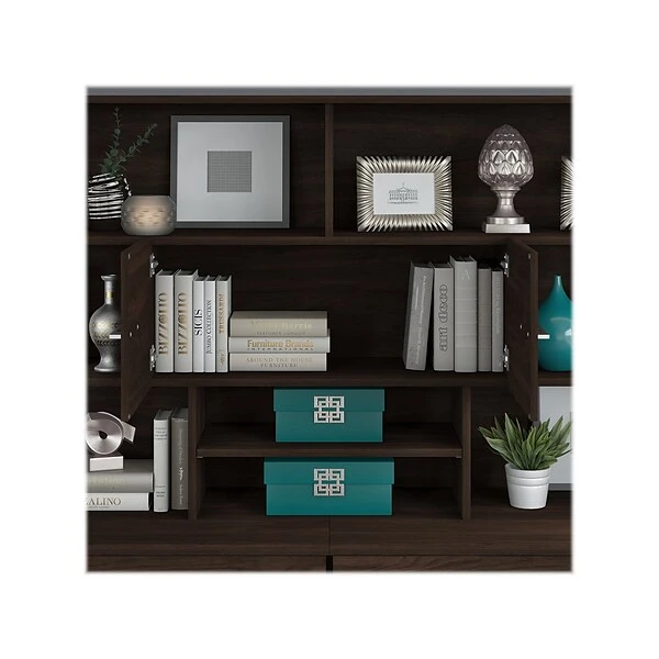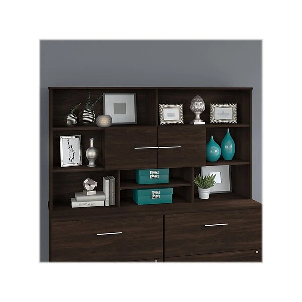 The Bush Business Furniture Office 500 71″W desk hutch combines open and closed storage to organize materials while brightening up the room with decorations. With its combination of open and closed storage, the Bush Business Furniture Office 500 desk hutch is a perfect way to keep any workspace in order while showcasing the style and personality of the today’s professional. This 71″W hutch attaches to the coordinating credenza desk, two 36″W lateral file cabinets, or two 36″W storage cabinets (sold separately). Cubbies on the right and left offer plenty of room to display pictures, awards, and other decorations while the large top shelves are perfect for organizing books. The center of the hutch features a small cabinet that keeps office supplies and reference materials out of sight but easily accessible. Below the cabinet is an adjustable shelf that can be used to store work in progress. This hutch is tested to meet ANSI/BIFMA standards for safety and performance and is backed by a 10-year warranty. American-made with US and imported parts.