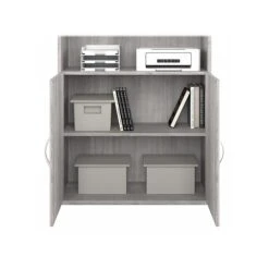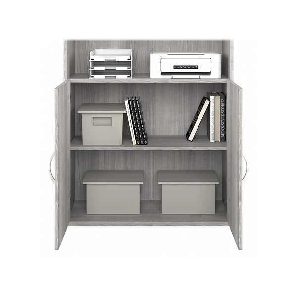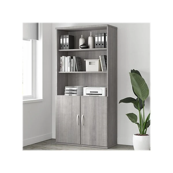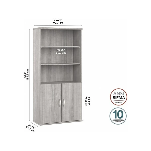 The Bush Business Furniture Studio A tall five-shelf bookcase with doors combines a fresh contemporary appearance with the commercial-quality construction needed to withstand years of everyday use. Organize books and reference materials, or display pictures and decorations on the shelves that support up to 50 lbs. each. Two shelves are fixed for stability, while three can be raised or lowered to accommodate items of various sizes. The cabinet doors conceal the two lower shelves for the materials you want kept in order but out of sight. The tall bookcase’s stable design and wall attachment hardware make it a safe choice for use in virtually any home or professional office environment. This tall bookcase has been meticulously tested to meet or exceed the ANSI/BIFMA standards for safety, durability, and performance and is backed by a 10-year warranty. American-made with US and imported parts.
