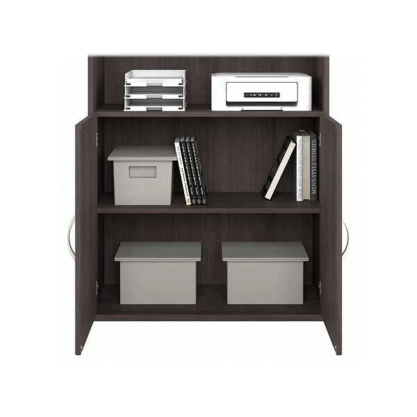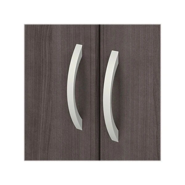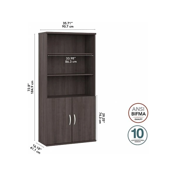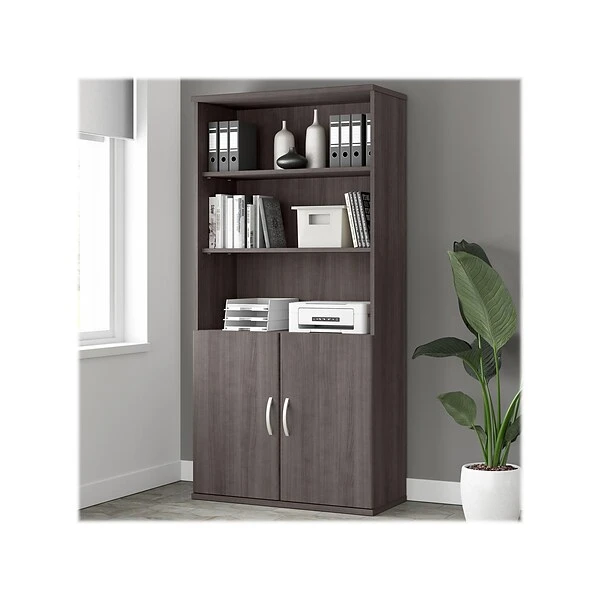 The Bush Business Furniture Studio A tall five-shelf bookcase with doors combines a fresh contemporary appearance with the commercial-quality construction needed to withstand years of everyday use. Organize books and reference materials, or display pictures and decorations on the shelves that support up to 50 lbs. each. Two shelves are fixed for stability, while three can be raised or lowered to accommodate items of various sizes. The cabinet doors conceal the two lower shelves for the materials you want kept in order but out of sight. The tall bookcase’s stable design and wall attachment hardware make it a safe choice for use in virtually any home or professional office environment. This tall bookcase has been meticulously tested to meet or exceed the ANSI/BIFMA standards for safety, durability, and performance and is backed by a 10-year warranty. American-made with US and imported parts.