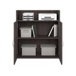 - Cabinet doors cover the two bottom shelves to conceal the items you want kept in order but out of sight