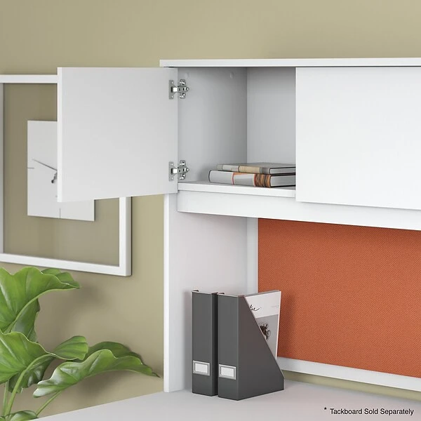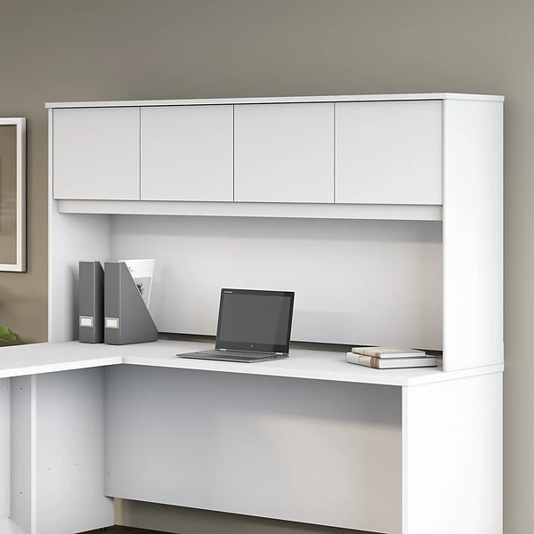 Organize your office with the durable, attractive and functional Bush Business Furniture Studio C 72W Hutch. With 4 doors featuring self-closing Euro-style hinges, the Hutch conveniently stores office supplies, books and more to keep your Studio C desk organized. The Hutch mounts to the 72W Office Desk or Credenza Desk (sold separately) and provides a fully finished back panel. Add a coordinating Tackboard (sold separately) to keep your important notes within sight while you work. The thermally fused laminate construction resists scratches, stains and damage throughout your 40-plus hour week. The classic Hutch design meets contemporary White and Storm Gray finish options to fit the needs of the modern workspace. The 4 door hutch comes with a 10 Year Warranty and meets ANSI/BIFMA quality test standards. See the full collection for coordinating items available to make your office your own with Studio C. American made with U.S. and imported parts.