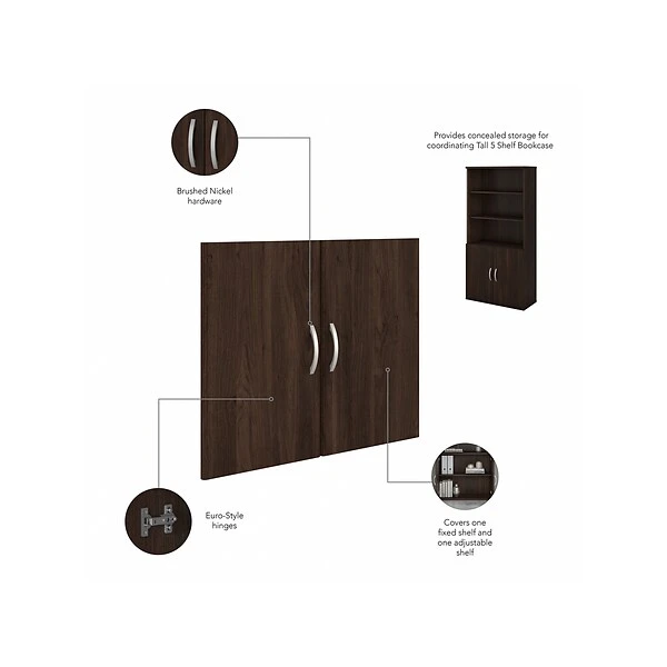 The Bush Business Furniture Studio C five-shelf bookcase with doors looks great, works hard, and adjusts to fit the needs of your office. Designed with two fixed and three adjustable shelves, the bookcase holds your books and reference materials with plenty of room for your favorite decorative accents. Confidently store a variety of items on the spacious and durable shelves, designed to hold up to 50 lbs. each. A thermally fused laminate finish fends off everyday damage such as scratches and stains throughout years of everyday use. Two doors with smooth Euro-style hinges conceal your office supplies and add an eye-catching touch to your workspace. This tall bookcase with doors comes with a 10-year warranty and meets ANSI/BIFMA quality test standards. See the full collection for coordinating items available to make your office your own with Bush Business Furniture Studio C. American-made with US and imported parts.