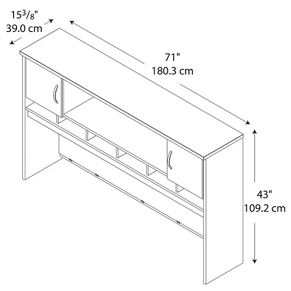 Bush Business Furniture Westfield 72W 2 Door Hutch in Mahogany for classic styling with clean lines and extended modesty panels. Mount the Hutch to the 72W Desk or Credenza Shell, Corner Modules and combined Lateral Files. Constructed with 100% thermally fused laminate for durability and superior resistance to scratches and stains. Includes a central open storage, six work-in-progress shelves and a closed compartment with self-closing, Euro-style hinges. Wire management grommets keep plugs and cables under control. Fully finished, fabric back panel with a tackboard, plus works with two Task Lights. Solid construction meets ANSI/BIFMA test standards in place at time of manufacture. The Westfield Collection is backed by the Bush Business Furniture 10-Year Warranty. American made with U.S. and imported parts.
