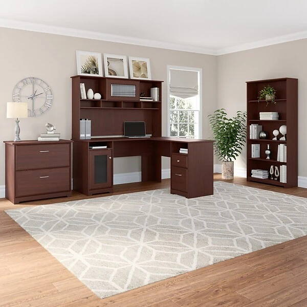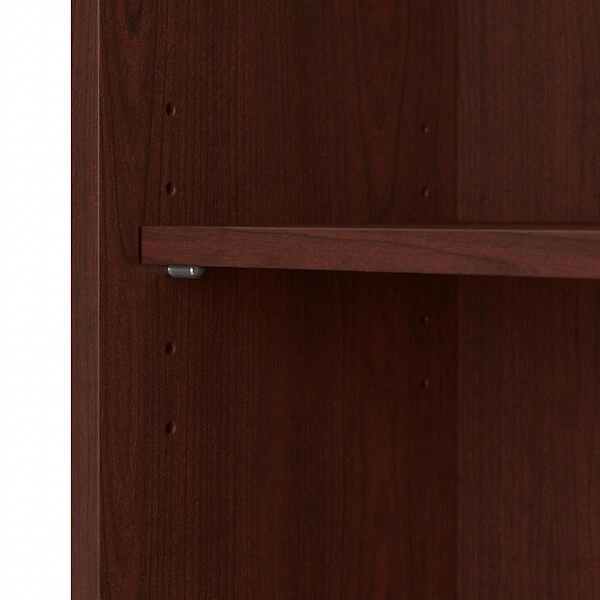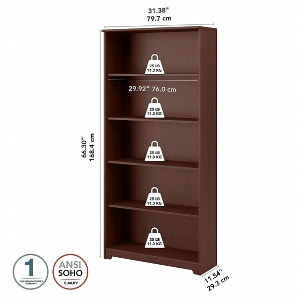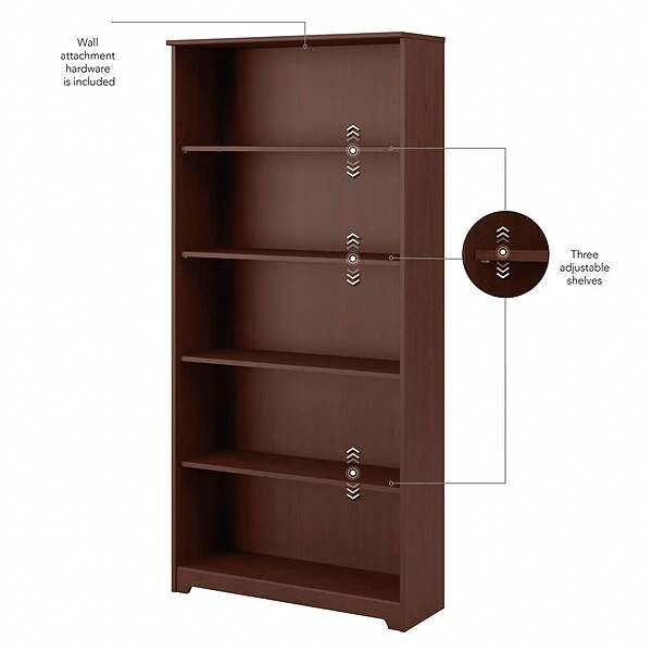 This attractive Bush Furniture Cabot 5 Shelf Bookcase is perfect for the home office or anywhere storage is needed. Its slender profile and 5 shelf design mix style with function at a great value. Use on its own or group a few together for a complete storage wall design. When outfitting an office use this Bookcase next to the Cabot Desk with Hutch combination (sold separately) for a seamless look as they match in height. The sophisticated, stable design has two fixed shelves for structural strength while three adjustable shelves let you customize so all of your items are sure to fit. The bookshelf lets you easily stow books, binders, decorative bins, accents and more. Meets ANSI/SOHO test standards for safety and performance. A stylish and timeless design with rich finish complements any environment. See the full collection for coordinating items. Backed by a 1 Year Warranty.