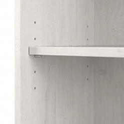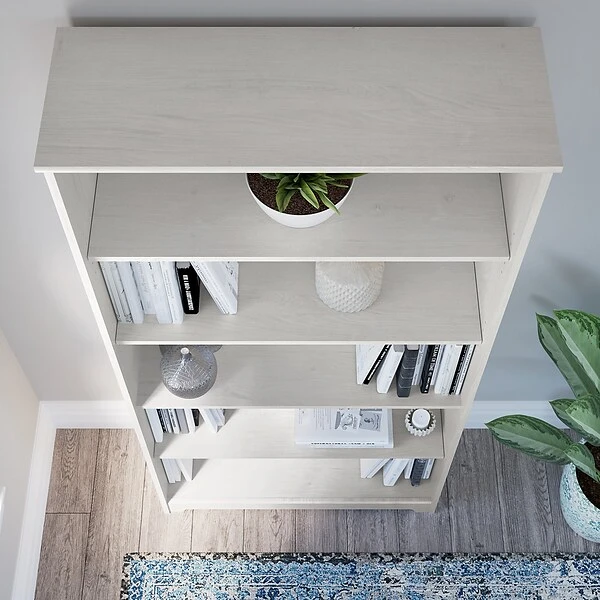 This attractive Bush Furniture Cabot five-shelf bookcase is perfect for the home office, living room, or anywhere practical storage is needed. Its sleek profile and tall design mix style and function at a great value. Use on its own or group a few together for a complete storage wall. The sophisticated, stable design has two fixed shelves for structural strength and three adjustable shelves that move up or down to accommodate items of various sizes. Each shelf supports up to 25 lbs. so you can confidently store a collection of paperback and hardcover books or brighten up the room with your favorite decorations. Wall attachment hardware is included for family-friendly safety and security. This tall bookshelf is tested to meet ANSI/SOHO standards for safety and performance and is backed by a 1-year manufacturer warranty.