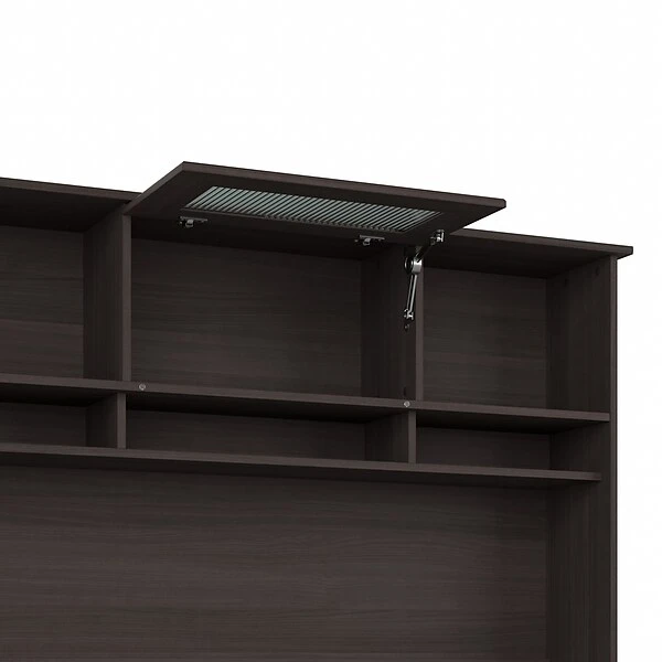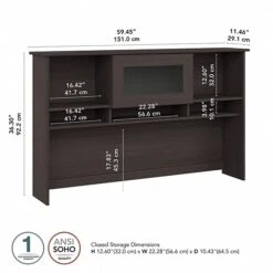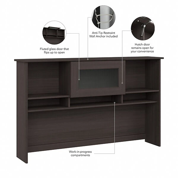 The Bush Furniture Cabot 60W Desk Hutch presents a home office storage solution with transitional style. Enjoy plenty of space to organize important work materials and brighten up your workspace with plants, pictures, and other decorations. The center cabinet’s fluted glass door flips up to reveal a compartment that’s perfect for the items you want kept in order but out of sight. Open shelves to the left and right offer an ideal place to stash a small collection of books or show off your favorite decorations. Three open cubbies at the bottom provide easy access to work-in-progress and frequently used materials. The design leaves room for monitors up to 18 inches high while a space at the bottom allows cords and cables to pass through conveniently. Choose from several traditional and contemporary finish options for an appearance that complements your own space and taste. Wall attachment hardware is included for family-friendly safety and security in any home office or living space. This computer hutch has been rigorously tested to meet or exceed ANSI/SOHO quality standards for safety and performance and is backed by the Bush Furniture 1 Year Manufacturer’s Warranty. See the full Cabot Collection for coordinating items to complete your transitional workspace, including desks, chairs, file cabinets, bookcases, and more (sold separately).