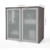 - Closed storage compartment with fluted glass door keeps materials and supplies in order and out of sight