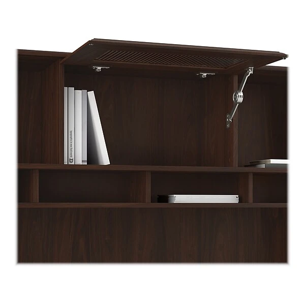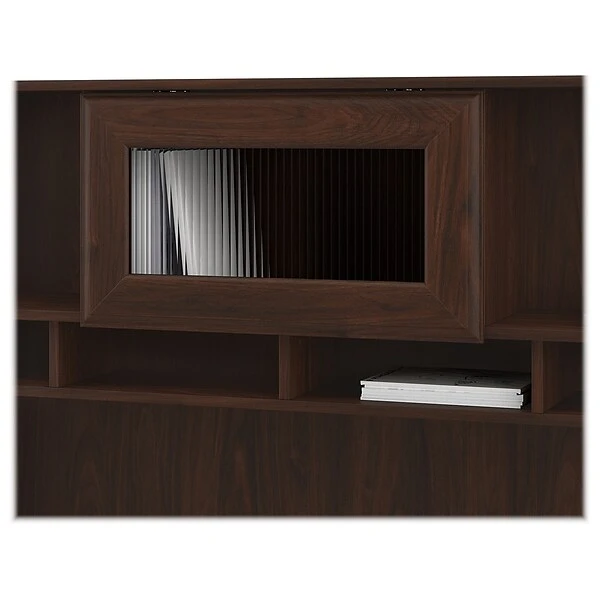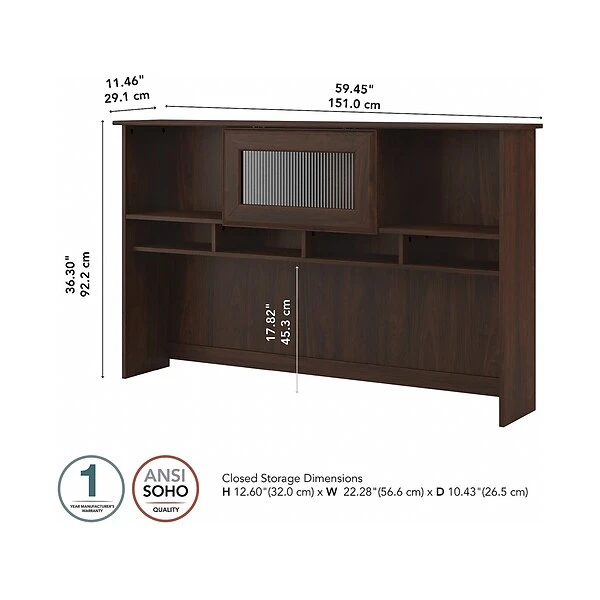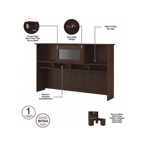 The Bush Furniture Cabot 60″W hutch for corner or L-shaped desk offers beautiful looks, convenient features, and organization options to complete any home office. The elegant design of the Bush Furniture Cabot desk hutch adds plenty of practical storage space to any home office. Used with the coordinating Bush Furniture Cabot L-shaped computer desk or a corner desk with storage (sold separately), the hutch offers a place for reference materials, supplies, decorations, and more. Four open cubby shelves provide easy access to papers or work in progress to keep you on task. Two tall compartments handle oversized books, binders, manuals, or decorations. A stylish fluted glass door delivers a sophisticated touch while concealing unsightly materials and supplies. Organize your cords with an integrated cable management system. The hutch meets ANSI/BIFMA quality standards for safety and performance and is backed by a 1-year manufacturer warranty.