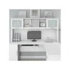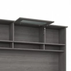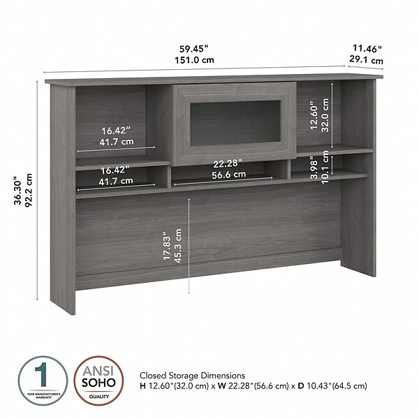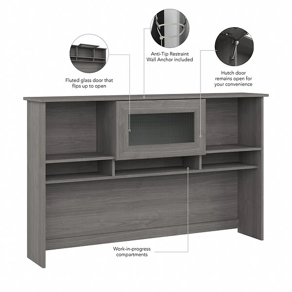 The Bush Furniture Cabot 60W Desk Hutch presents a home office storage solution with transitional style. Enjoy plenty of space to organize important work materials and brighten up your workspace with plants, pictures, and other decorations. The center cabinet’s fluted glass door flips up to reveal a compartment that’s perfect for the items you want kept in order but out of sight. Open shelves to the left and right offer an ideal place to stash a small collection of books or show off your favorite decor. Three open cubbies at the bottom provide easy access to work-in-progress and frequently used materials. The design leaves room for monitors up to 18 inches high while a space at the bottom allows cords and cables to pass through conveniently. This computer hutch has been rigorously tested to meet or exceed ANSI/SOHO standards for safety and performance and is backed by a 1 Year Warranty.