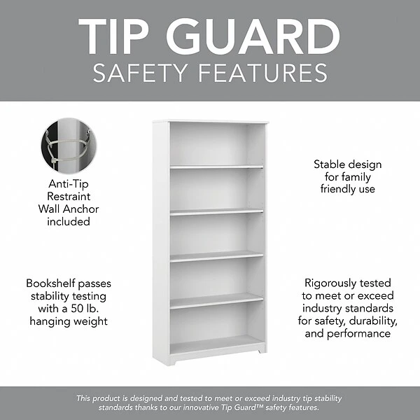 The Bush Furniture Cabot 5 Shelf Bookcase presents a home office storage solution with transitional style. Featuring a design that’s as versatile as it is practical, this tall bookshelf offers an ideal way to organize important work materials, a collection of books or other media, miscellaneous household items, and more. Two shelves are fixed for stability while three can be raised or lowered to accommodate items of various sizes. Each shelf can support up to 25 pounds, so storing larger books and decorations is never a problem. A stable design and included wall attachment hardware makes this standing shelf a great choice for use in a variety of living spaces. This Tall Bookcase has been rigorously tested to meet or exceed ANSI/SOHO standards for safety and performance and is backed by a 1 Year Manufacturer’s Warranty. See the full Cabot Collection for coordinating items available.