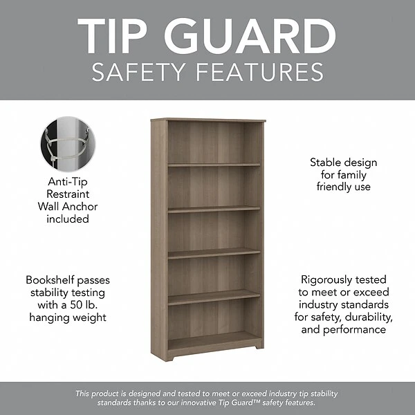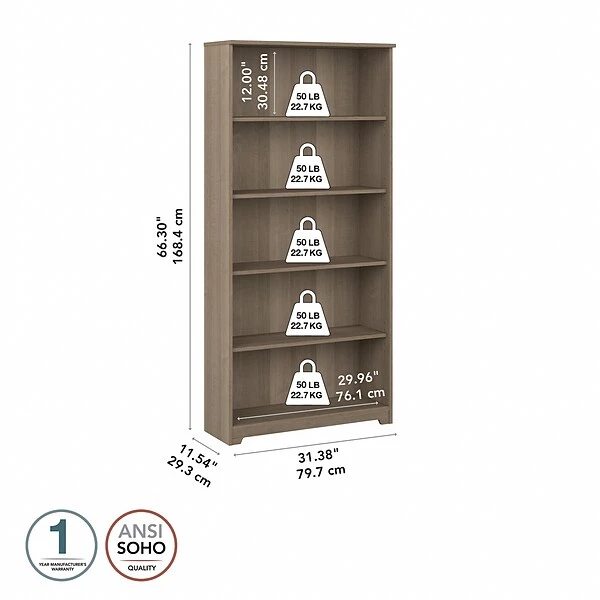 The Bush Furniture Cabot 5 Shelf Bookcase presents a home office storage solution with transitional style. Featuring a design that’s as versatile as it is practical, this tall bookshelf offers an ideal way to organize important work materials, a collection of books or other media, miscellaneous household items, and more. Two shelves are fixed for stability while three can be raised or lowered to accommodate items of various sizes. Each shelf can support up to 25 pounds, so storing larger books and decorations is never a problem. A stable design and included wall attachment hardware makes this standing shelf a great choice for use in a variety of living spaces. This Tall Bookcase has been rigorously tested to meet or exceed ANSI/SOHO standards for safety and performance and is backed by a 1 Year Manufacturer’s Warranty. See the full Cabot Collection for coordinating items available.