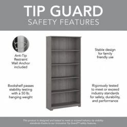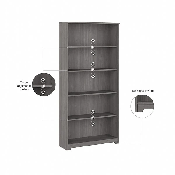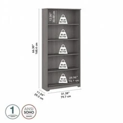 The Bush Furniture Cabot Tall 5 Shelf Bookcase presents a home office storage solution with transitional style. Featuring a design that’s as versatile as it is practical, this tall bookshelf offers an ideal way to organize important work materials, a collection of books or other media, miscellaneous household items, and more. Two shelves are fixed for stability while three can be raised or lowered to accommodate items of various sizes. Each shelf can support up to 25 pounds, so storing larger books and decorations is never a problem. A stable design and included wall attachment hardware makes this standing shelf a great choice for use in a variety of living spaces. This Tall Bookcase has been rigorously tested to meet or exceed ANSI/SOHO standards for safety and performance and is backed by a 1 Year Manufacturer’s Warranty. See the full Cabot Collection for coordinating items available.