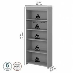 Bring a slice of modern farmhouse styling into any home office or living space with the Bush Furniture Fairview tall five-shelf bookcase. Three adjustable shelves move up and down to accommodate books and decorations of various sizes while two fixed shelves provide extra stability. Each shelf supports up to 50 lbs., so organizing a collection of paperback and hardcover books is no problem. This bookcase offers plenty of vertical storage to keep your personal library in order without taking up too much floor space. Use a single bookcase on its own, or place a set of two or more side by side for even more storage and display capacity. This farmhouse bookcase is tested to meet ANSI/SOHO quality standards for safety and performance and is backed by a 6-year manufacturer warranty. See the full collection for coordinating items to complete your space with relaxed cottage styling.