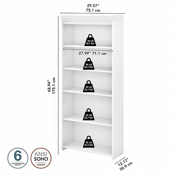 Bring a slice of modern farmhouse styling into any home office or living space with the Bush Furniture Fairview tall five-shelf bookcase. Three adjustable shelves move up and down to accommodate books and decorations of various sizes while two fixed shelves provide extra stability. Each shelf supports up to 50 lbs., so organizing a collection of paperback and hardcover books is no problem. This bookcase offers plenty of vertical storage to keep your personal library in order without taking up too much floor space. Use a single bookcase on its own, or place a set of two or more side by side for even more storage and display capacity. This farmhouse bookcase is tested to meet ANSI/SOHO quality standards for safety and performance and is backed by a 6-year manufacturer warranty. See the full collection for coordinating items to complete your space with relaxed cottage styling.