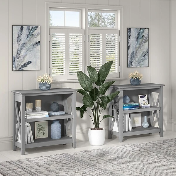 The Bush Furniture Key West small two-shelf bookcase offers a practical storage and display solution that gives your home a touch of casual style. This small bookshelf features a compact, versatile design that makes it a perfect choice for use in a home office, living room, entryway, or virtually any other residential space. One fixed shelf and one adjustable shelf accommodate books, reference materials, and decorations of various sizes. Each shelf supports up to 35 lbs., so you can store and display larger items with confidence. A post leg design and X-pattern accents convey a casual appearance that works well with cottage, coastal, and modern farmhouse style. This small bookcase has been tested to meet ANSI/SOHO quality standards for safety and performance and is backed by a 1-year warranty. See the full collection for coordinating items available.