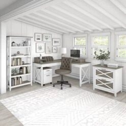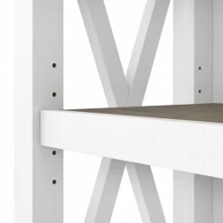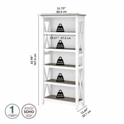 The Bush Furniture Key West tall five-shelf bookcase is a perfect way to show off your favorite artwork, photos, plants, and more. Three adjustable shelves accommodate items of various sizes while two fixed shelves provide stability. Each shelf supports up to 50 lbs. so you can store your personal library and display decorations with confidence. Stylish touches include unique X-pattern accents on the side panels as well as a sturdy and attractive post leg design. This five-tier bookcase includes wall attachment hardware for family-friendly safety and security in any home office or living room. A perfect choice for homes that embrace cottage, coastal, and farmhouse decor, the Bush Furniture Key West collection includes a variety of coordinating items to expand your space as needed. This tall bookcase is tested to meet ANSI/SOHO quality standards for safety and performance and is backed by a 1-year manufacturer warranty.