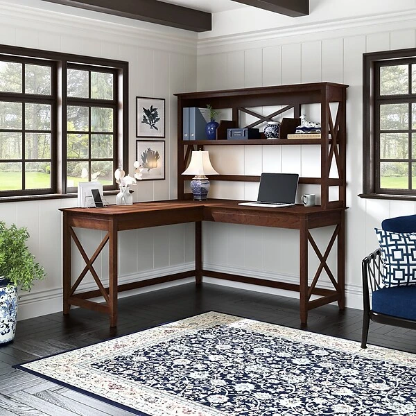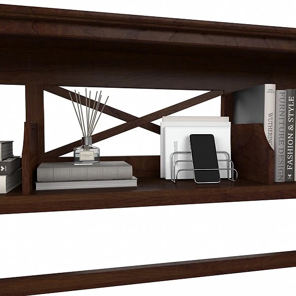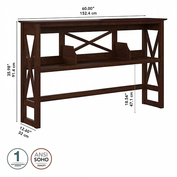 The Bush Furniture Key West 60″W desk hutch attaches to the coordinating 60″W L-shaped desk (sold separately) for increased home office storage and display capacity. Three open storage compartments offer plenty of room to organize work materials or show off pictures and decorations. The hutch’s open design allows cords and cables to pass through conveniently. X-pattern accents convey a casual appearance that works well with cottage, coastal, and modern farmhouse style. Finish options include linen white oak, reclaimed pine, dark gray hickory, pure white/shiplap gray, washed gray, Bing cherry, pure white oak, and Cape Cod gray. Wall attachment hardware is included for family-friendly safety and security. This computer desk hutch has been tested to meet ANSI/SOHO quality standards for safety and performance and is backed by the Bush Furniture 1-year manufacturer warranty.