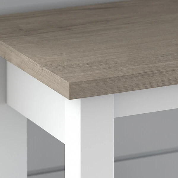 - Made of laminate over composite wood in a stylish pure white and shiplap gray two-tone finish