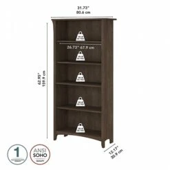 Decorative yet functional, the Bush Furniture Salinas five-shelf bookcase brings comfortable storage and display to any room in your home. Inspired by timeless Mission styling, this tall bookcase conveys a relaxing farmhouse charm with its attractive wood accents and tapered legs. Decorative detailing and curved base rails create a casual construction equally fit for a living room or home office. Built with three adjustable shelves for flexible storage and two fixed shelves for stability, the 62.95″H x 31.73″W x 12.17″D bookcase proudly displays your personal library along with photos and decorations. Each shelf supports up to 50 lbs., so storing larger items is never a problem. The five-shelf bookcase is tested to meet ANSI/SOHO quality standards for safety and performance and is backed by a 1-year manufacturer’s warranty. Complete your space with coordinating items from the Salinas collection.