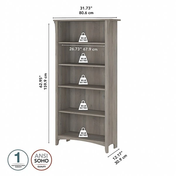 Decorative yet functional, the Bush Furniture Salinas five-shelf bookcase brings comfortable storage and display to any room in your home. Inspired by timeless Mission styling, this tall bookcase conveys a relaxing farmhouse charm with its attractive wood accents and tapered legs. Decorative detailing and curved base rails create a casual construction equally fit for a living room or home office. Built with three adjustable shelves for flexible storage and two fixed shelves for stability, the 62.95″H x 31.73″W x 12.17″D bookcase proudly displays your personal library along with photos and decorations. Each shelf supports up to 50 lbs., so storing larger items is never a problem. The five-shelf bookcase is tested to meet ANSI/SOHO quality standards for safety and performance and is backed by a 1-year manufacturer’s warranty. Complete your space with coordinating items from the Salinas collection.