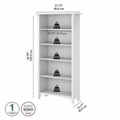 Decorative yet functional, the Bush Furniture Salinas five-shelf bookcase brings comfortable storage and display to any room in your home. Inspired by timeless Mission styling, this tall bookcase conveys a relaxing farmhouse charm with its attractive wood accents and tapered legs. Decorative detailing and curved base rails create a casual construction equally fit for a living room or home office. Built with three adjustable shelves for flexible storage and two fixed shelves for stability, the 62.95″H x 31.73″W x 12.17″D bookcase proudly displays your personal library along with photos and decorations. Each shelf supports up to 50 lbs., so storing larger items is never a problem. The five-shelf bookcase is tested to meet ANSI/SOHO quality standards for safety and performance and is backed by a 1-year manufacturer’s warranty. Complete your space with coordinating items from the Salinas collection.