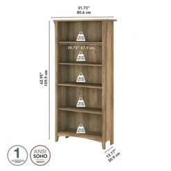 Decorative yet functional, the Bush Furniture Salinas five-shelf bookcase brings comfortable storage and display to any room in your home. Inspired by timeless Mission styling, this tall bookcase conveys a relaxing farmhouse charm with its attractive wood accents and tapered legs. Decorative detailing and curved base rails create a casual construction equally fit for a living room or home office. Built with three adjustable shelves for flexible storage and two fixed shelves for stability, the 62.95″H x 31.73″W x 12.17″D bookcase proudly displays your personal library along with photos and decorations. Each shelf supports up to 50 lbs., so storing larger items is never a problem. The five-shelf bookcase is tested to meet ANSI/SOHO quality standards for safety and performance and is backed by a 1-year manufacturer’s warranty. Complete your space with coordinating items from the Salinas collection.