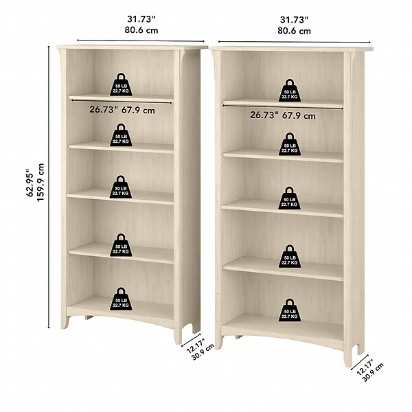 Decorative yet functional, this Bush Furniture Salinas set of two five-shelf bookcases brings comfortable storage and display to any room in your home. Inspired by timeless mission style, the set conveys a relaxing farmhouse charm with its attractive wood accents and tapered legs. Decorative detailing and curved base rails create a casual construction equally fit for a living room or home office. Each tall bookcase is built with three adjustable shelves for flexible storage and two fixed shelves for stability to proudly display your personal library along with photos and decorations. Each shelf supports up to 50 lbs., so storing larger items is never a problem. This matching bookcase set is tested to meet ANSI/SOHO standards for safety and performance and is backed by a 1-year manufacturer warranty. See the full collection for coordinating items available.