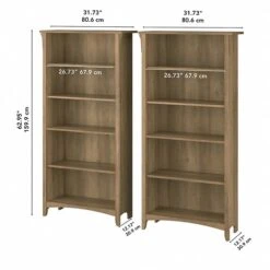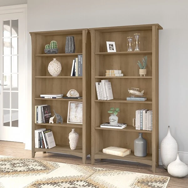 Decorative yet functional, this Bush Furniture Salinas set of two five-shelf bookcases brings comfortable storage and display to any room in your home. Inspired by timeless mission style, the set conveys a relaxing farmhouse charm with its attractive wood accents and tapered legs. Decorative detailing and curved base rails create a casual construction equally fit for a living room or home office. Each tall bookcase is built with three adjustable shelves for flexible storage and two fixed shelves for stability to proudly display your personal library along with photos and decorations. Each shelf supports up to 50 lbs., so storing larger items is never a problem. This matching bookcase set is tested to meet ANSI/SOHO standards for safety and performance and is backed by a 1-year manufacturer warranty. See the full collection for coordinating items available.