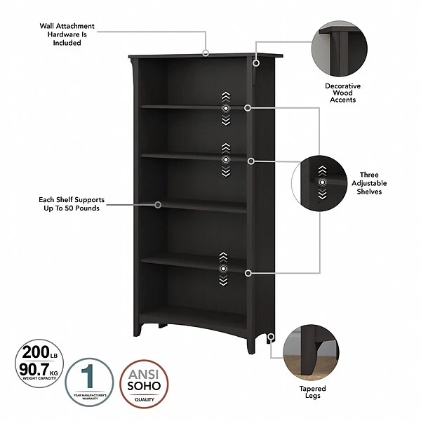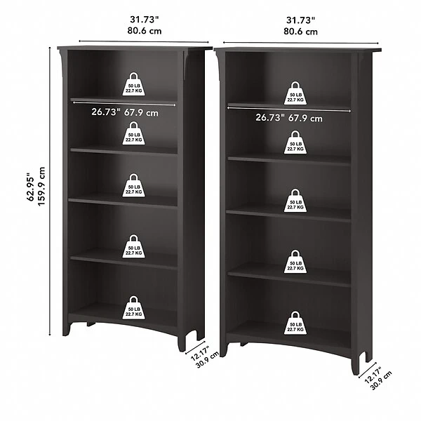 Decorative yet functional, this Bush Furniture Salinas set of two five-shelf bookcases brings comfortable storage and display to any room in your home. Inspired by timeless mission style, the set conveys a relaxing farmhouse charm with its attractive wood accents and tapered legs. Decorative detailing and curved base rails create a casual construction equally fit for a living room or home office. Each tall bookcase is built with three adjustable shelves for flexible storage and two fixed shelves for stability to proudly display your personal library along with photos and decorations. Each shelf supports up to 50 lbs., so storing larger items is never a problem. This matching bookcase set is tested to meet ANSI/SOHO standards for safety and performance and is backed by a 1-year manufacturer warranty. See the full collection for coordinating items available.