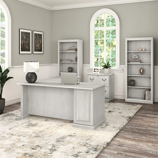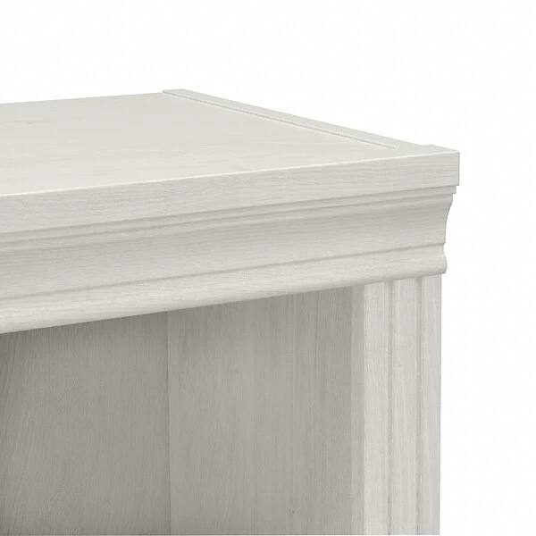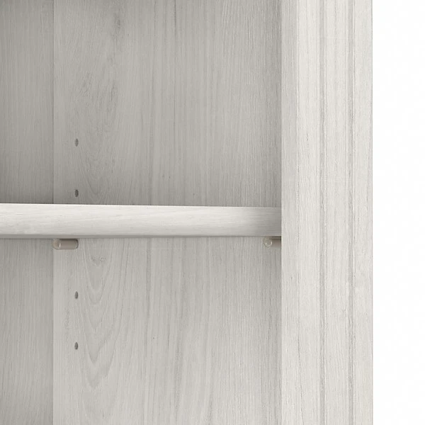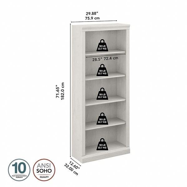 Enjoy the refined elegance of timeless traditional styling while showcasing your favorite books and decorations with the Bush Furniture Saratoga tall five-shelf bookcase. A perfect choice for virtually any office or private study, this vertical bookcase features three adjustable shelves for flexible storage space and two fixed shelves for strength and stability. Each shelf supports up to 25 lbs., so you can organize your personal library and display larger items with confidence. Hardware is included to safely anchor the tall bookcase to a wall. The bookcase’s classic appearance is enhanced by decorative top, base, and side rail detailing. This tall bookcase has been tested to meet ANSI/BIFMA standards for safety and performance and is backed by a 10-year warranty. Complete your workspace with a Saratoga desk, lateral file cabinet, and office chair (coordinating items sold separately).