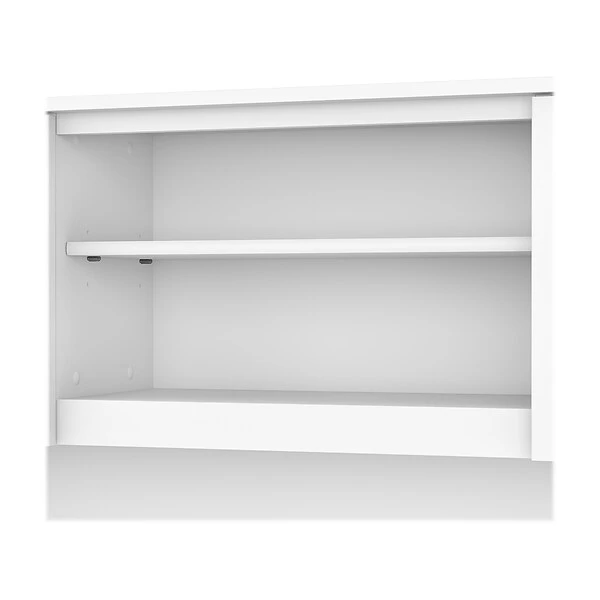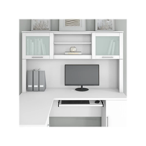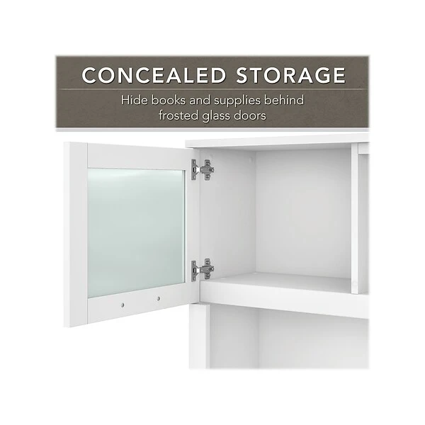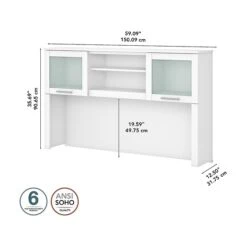 The Bush Furniture Somerset 60″W hutch offers the storage and display capacity you need to complete your beautiful and functional home office. The hutch mounts securely on either side of the coordinating 60″W L-shaped desk (sold separately) for increased capacity. Storage options include a large open compartment that is perfect for books, binders, or decorations as well as a pair of frosted glass doors that provide concealed storage to eliminate visual clutter. An adjustable shelf makes it easy to store items of various sizes. The hutch comes in a transitional styling with contemporary metal hardware. It is tested to meet ANSI/SOHO quality standards for safety and performance.