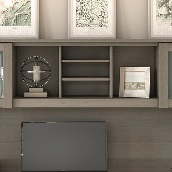 The Bush Furniture Somerset 72W Hutch offers the storage and display capacity you need to complete your beautiful and functional home office. The Hutch mounts securely on either side of the coordinating L Shaped Desk or 72W Office Desk with Drawers (both sold separately) for a customizable workspace solution. Storage options include large open compartments that are perfect for books, binders or decorations and two adjustable shelves to hold work-in-progress. A pair of lift-up frosted glass doors provide concealed storage to eliminate visual clutter. Transitional styling includes contemporary metal hardware and your choice of four stylish finishes for an alluring home office design. This quality furniture is tested to meet ANSI/SOHO standards for safety and performance and is backed by the Bush Furniture 6 Year Manufacturer’s Warranty. American made with U.S. and imported parts.