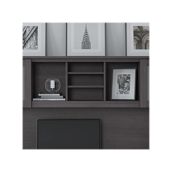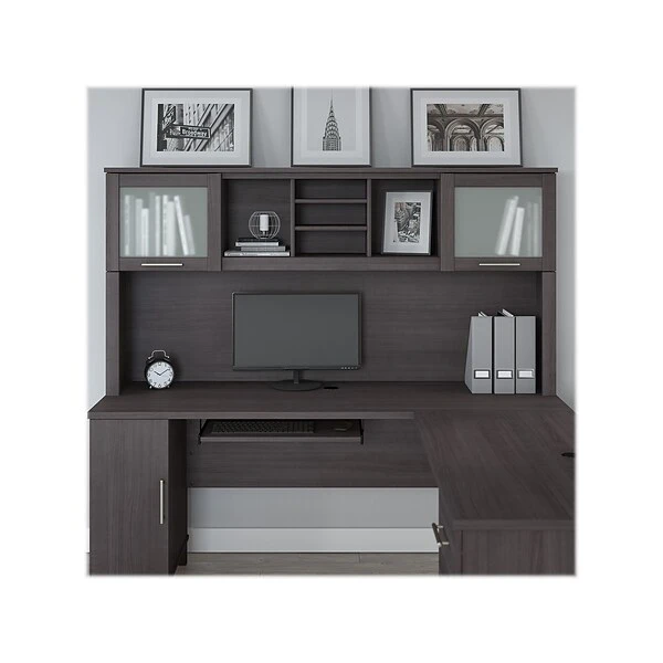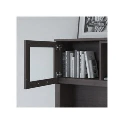 The Bush Furniture Somerset 72″W hutch offers the storage and display capacity you need to complete your beautiful and functional home office. The hutch mounts securely on either side of the coordinating L-shaped desk or 71″W office desk with drawers (both sold separately) for a customizable workspace solution. Storage options include large open compartments that are perfect for books, binders, or decorations and two shelves to hold work in progress. A pair of frosted glass doors provide concealed storage to eliminate visual clutter. The hutch comes in a transitional styling with contemporary metal hardware. It is tested to meet ANSI/SOHO quality standards for safety and performance.