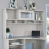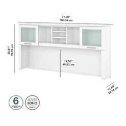The Bush Furniture Somerset 72″W hutch offers the storage and display capacity you need to complete your beautiful and functional home office. The hutch mounts securely on either side of the coordinating L-shaped desk or 71″W office desk with drawers (both sold separately) for a customizable workspace solution. Storage options include large open compartments that are perfect for books, binders, or decorations and two shelves to hold work in progress. A pair of frosted glass doors provide concealed storage to eliminate visual clutter. The hutch comes in a transitional styling with contemporary metal hardware. It is tested to meet ANSI/SOHO quality standards for safety and performance.
