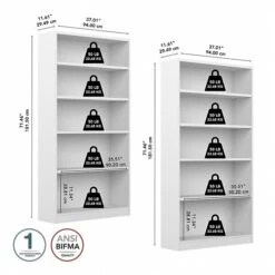The Bush Furniture Universal Tall 5 Shelf Bookcase – Set of 2 provides a versatile organization solution that allows you to show off your personal library or brighten up the room with pictures and decorations. Each Bookcase has three adjustable shelves that move up and down to accommodate larger items like binders and photo albums while two fixed shelves offer added stability. The sturdy one-inch thick shelves prevent sagging and have a weight capacity of 50 pounds each, so storing magazines, hardcover books, or vinyl records is never a problem. Tip Guard(TM) safety features include a stable design and wall attachment hardware for family-friendly safety in any space. The bookcases have been tested with a 50 pound hanging weight to create a safe environment in any space. This tall bookshelf set meets ANSI/BIFMA standards for safety and performance and is backed by a 1 Year Warranty.