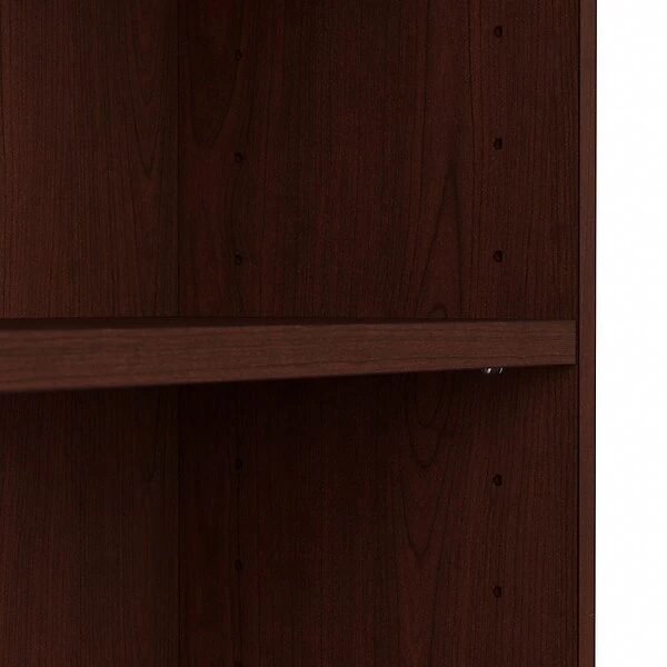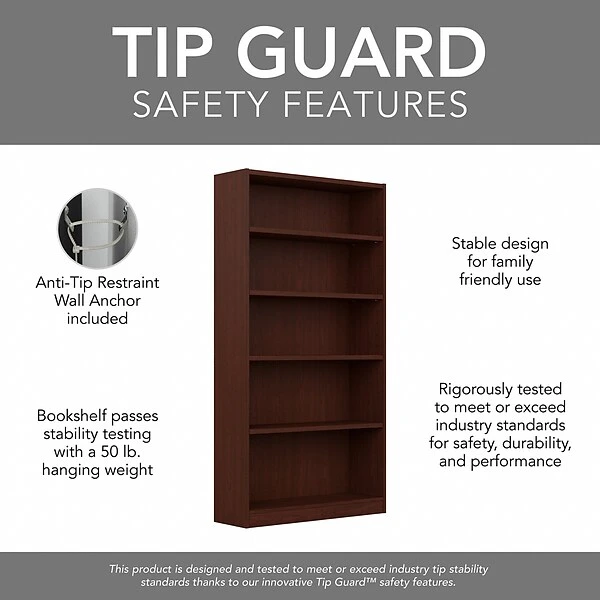 The Bush Furniture Universal Tall 5 Shelf Bookcase – Set of 2 provides a versatile organization solution that allows you to show off your personal library or brighten up the room with pictures and decorations. Each Bookcase has three adjustable shelves that move up and down to accommodate larger items like binders and photo albums while two fixed shelves offer added stability. The sturdy one-inch thick shelves prevent sagging and have a weight capacity of 50 pounds each, so storing magazines, hardcover books, or vinyl records is never a problem. Tip Guard(TM) safety features include a stable design and wall attachment hardware for family-friendly safety in any space. The bookcases have been tested with a 50 pound hanging weight to create a safe environment in any space. This tall bookshelf set meets ANSI/BIFMA standards for safety and performance and is backed by a 1 Year Warranty.