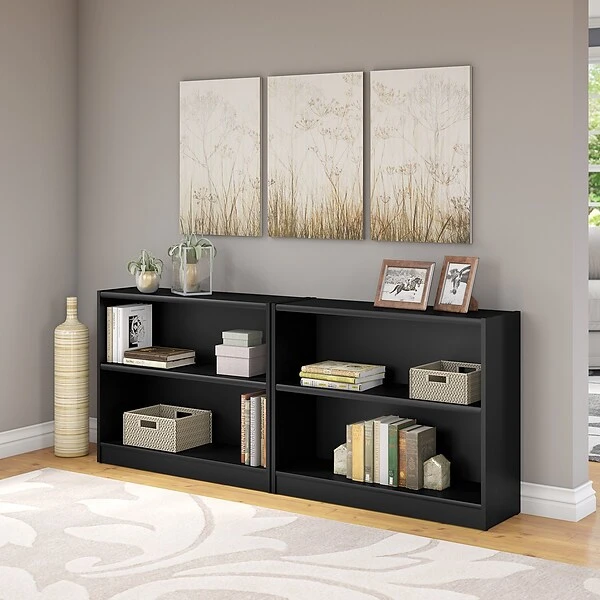 The Bush Furniture Universal Small 2 Shelf Bookcase – Set of 2 provides a versatile organization solution that makes it easy to show off your personal library or brighten up the room with pictures and decorations. Perfect for residential and professional use, this durable horizontal bookshelf is designed to excel anywhere flexible storage and display capacity is needed. A one-inch thick adjustable shelf prevents sagging and moves up and down to accommodate larger items like binders and photo albums while one fixed shelf gives the low bookcase added stability. Shelves have a weight capacity of 50 pounds each, so storing magazines, hardcover books, or vinyl records is never a problem. Tip Guard(TM) safety features include a stable design and wall attachment hardware for family-friendly safety in any space. This small bookshelf set meets ANSI/BIFMA quality standards for safety and performance and is backed by a 1 Year Manufacturer’s Warranty.