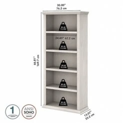 The Bush Furniture Yorktown tall five-shelf bookcase presents a stylish and practical solution for organizing any work or living space. Use the five-tier bookshelf to showcase your personal library or brighten up the room with pictures and home decor. Three adjustable shelves move up and down to accommodate items of various sizes while two shelves are fixed for stability. Each shelf supports up to 25 lbs., so you can store a collection of hardcover books and display larger decorations with confidence. Wall attachment hardware is included for family-friendly safety and security. Bush Furniture Yorktown’s classic charm is highlighted by stylish beveled edge detailing and comes in your choice of several attractive finishes. This vertical bookshelf is tested to meet ANSI/SOHO standards for safety and performance and is backed by a 1-year manufacturer warranty. See the full collection for coordinating items available.
