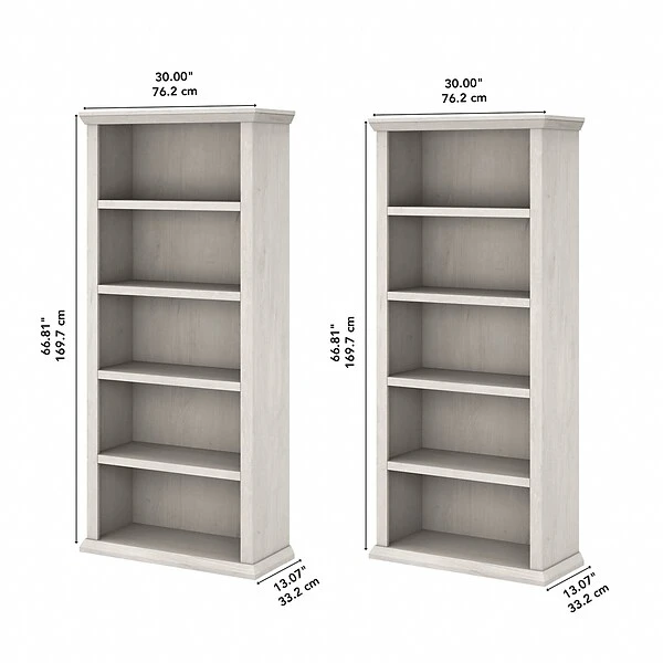 The Bush Furniture Yorktown tall five-shelf bookcase set of two presents a stylish and practical solution for organizing any work or living space. Use the matching bookcases to showcase your personal library or brighten up the room with pictures and home decor. Both bookcases include three adjustable shelves that move up and down to accommodate items of various sizes and two shelves that are fixed for stability. Each shelf supports up to 25 lbs., so you can store a collection of hardcover books and display larger decorations with confidence. Wall attachment hardware is included for family-friendly safety and security. Bush Furniture Yorktown’s classic charm is highlighted by stylish beveled edge detailing and comes in linen white oak finish. This tall bookcase set is tested to meet ANSI/SOHO standards for safety and performance and is backed by a 1-year manufacturer warranty.