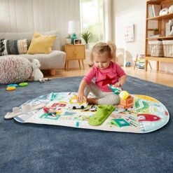 ?In baby’s city, dogs crinkle, cats jingle, and shiny campers fly in the sky. A panda and a sloth are workout buddies and the ice cream truck delivers treats to the snowy mountains. The Activity City Gym to Jumbo Playmat from Fisher-Price offers almost 4 feet of space for your baby to explore as they grow from lay and play, to tummy time, to sitting up and zooming all around. It comes with 7 toys, including a self-discovery mirror and bat-at toys that attach to the removable toy bar, plus a push-along ice cream truck that plays up to 25 minutes of music. As your child grows, the playmat becomes the setting for endless driving adventures as toddlers push the play pieces from the farm through the city and over the highest snowy peaks. Exploring this city helps strengthen baby’s gross motor skills, as well as engaging their visual and auditory senses.