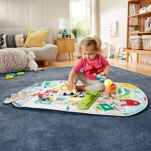 - ?Infant activity gym with extra-large, machine-washable playmat that becomes a vehicle mat for toddler play
