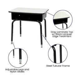 If you need a sturdy addition to the classroom, a dedicated workspace for homeschooling and homework, or a place for the little ones to playschool then the Student Desk with Metal Book Box is just the ticket. The high pressure laminate top is .625 inches thick with a black lacquer edge treatment for safety. Under the desktop is a spacious, heavy-duty, black metal book box with ample room for books, papers, and other supplies. The one-of-a-kind crisscross tubular frame ensures stability and the legs are height adjustable to fit students of all sizes. Adjustable nylon glides keep the desk from wobbling on uneven surfaces and protect your floors by sliding smoothly when you need to move them. This open front book box desk is recommended for students from elementary through high school.