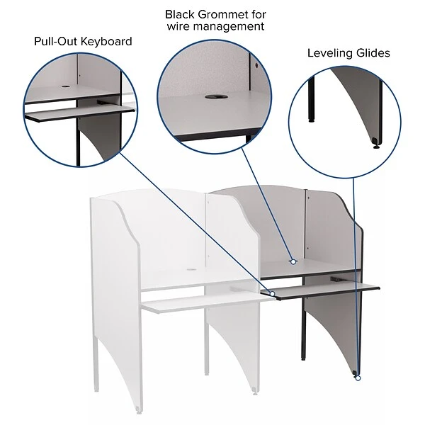 - Features add-on study floor carrels that are attached to desk with metal connectors